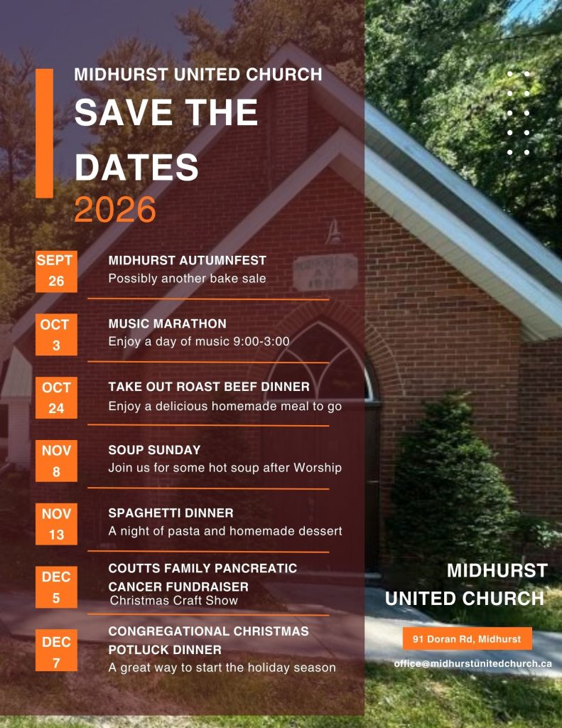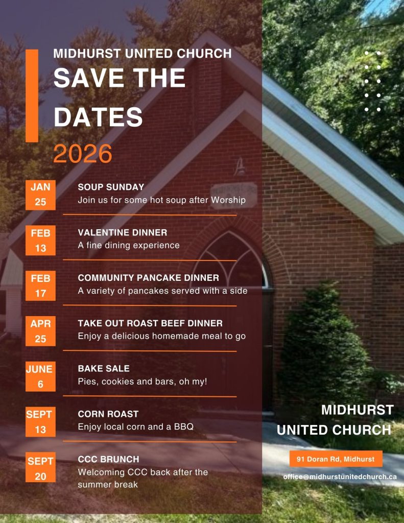 Stay tuned for more information on the following activities planned for 2026 at Midhurst United Church!